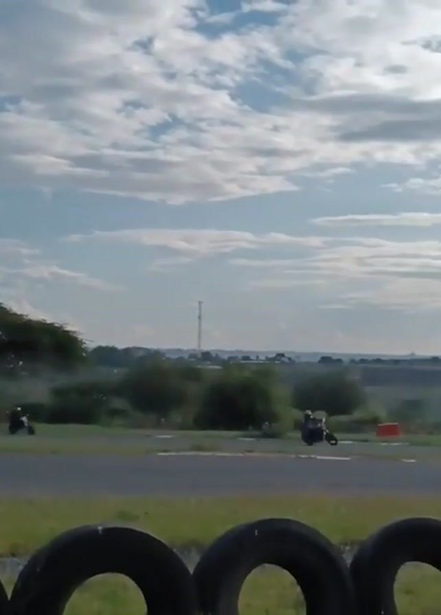 two motorcycles racing on a paved track on a sunny day with a partly cloudy sky. The motorcycles are seen from behind a barrier of tires. The surrounding environment includes green grass, scattered trees, and a distant landscape with a communication tower visible on the horizon.