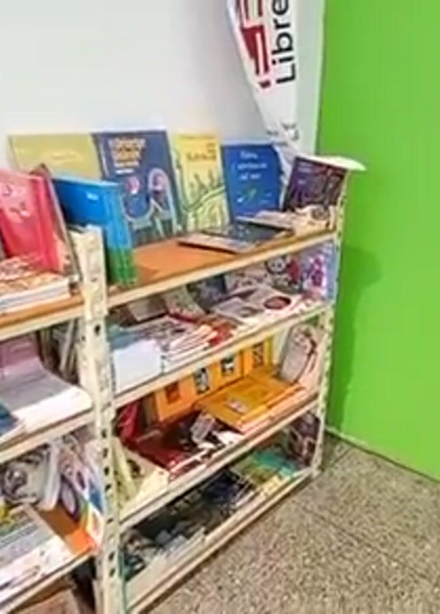 bookshelf filled with a variety of books, primarily children's books, standing in front of a green wall. The bookshelf appears to be made of light-colored metal. The books are arranged somewhat haphazardly, with many laid flat. The video pans slowly from left to right, providing a better view of the books. Someone speaking in Spanish can be heard in the background.