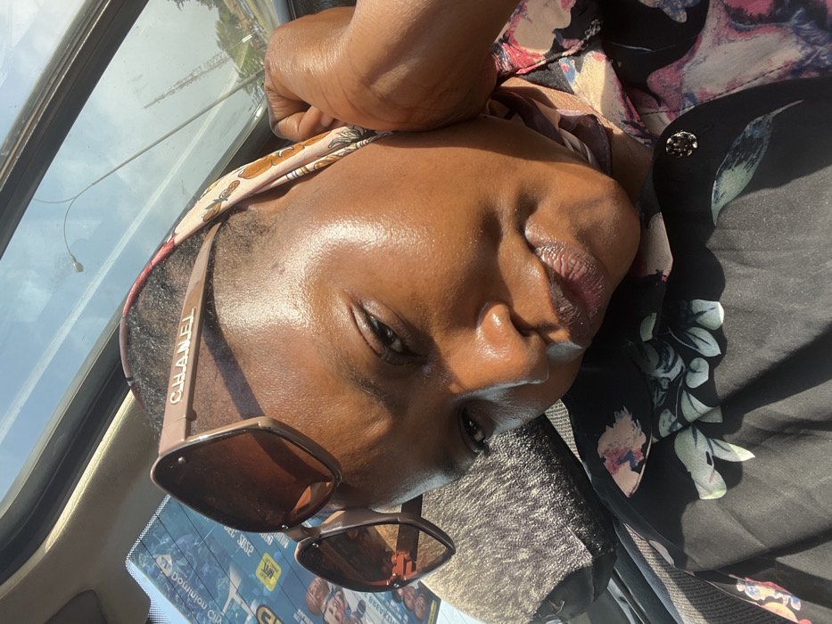 A single individual with dark skin is depicted in a close-up shot, presumably within a vehicle, located in Kugbo, Nigeria. The person gazes directly into the camera with a slight head tilt and partially pursed lips. Brown-framed sunglasses, marked "CHANEL" on the left temple, rest on their forehead. A light-colored headscarf with a floral pattern is worn, complementing a dark-colored shirt also featuring a floral design and a single decorative button on the placket. Direct sunlight illuminates the individual's face and shoulders. The exterior environment, visible through the vehicle's windows, shows a bright, partially cloudy sky, a distant street light or utility pole, and a taller antenna structure. A blue advertisement or poster, displaying faces and text, is visible on the inner surface of the windshield on the left side.