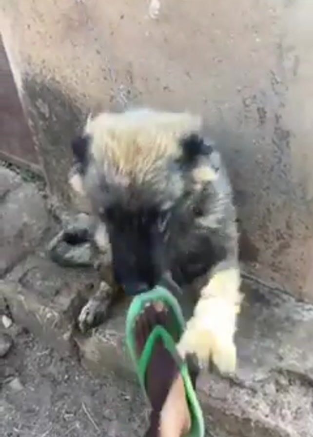 A young dog on a chain sits next to a concrete wall. It has mottled brown and black fur. A person wearing bright green shoes walks into frame, and the dog starts barking and then pants with its tongue out. The dog stays close to the wall. The ground is dirt.