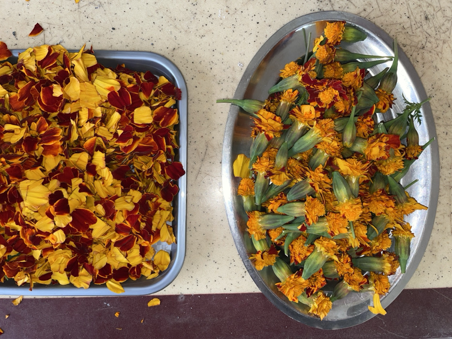 The image displays an overhead view of two metallic containers on a light-colored, possibly concrete or tiled surface with a darker strip on the left. The upper container, rectangular with rounded corners, is filled with a dense collection of loose marigold petals, primarily yellow and deep red-orange. The lower container, oval-shaped and also metallic, holds numerous whole marigold flower heads, mostly orange-yellow, each with intact green calyxes and short stems. A few loose petals are scattered on the surface around the containers. There are no individuals visible. This scene is located in the city of Danilovgrad, Montenegro.