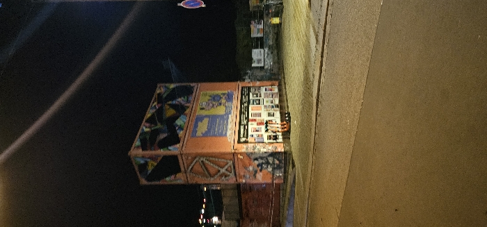 An oddly shaped orange building sits beside a sidewalk at night. The building is decorated with colorful patterns, posters, and various images. A traffic sign is visible above the structure. The street appears illuminated, while the sky behind the building is dark, possibly indicating the evening hours. The sidewalk is constructed of large, gray concrete slabs.