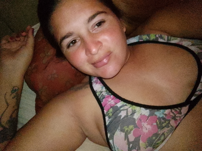 An adult female subject is depicted in a close-up, head-and-upper-torso shot, facing the camera directly while lying down. Her head is angled slightly to the viewer's right. She has a light to medium skin tone, dark hair pulled back, brown eyes, and a slightly reddened complexion on the face. Her lips are slightly parted. She wears a floral-patterned garment, possibly a camisole or bralette, which features pink and light blue flowers on a grey background with a black trim. A black tattoo with an abstract design is visible on her left forearm. Her left arm is bent, with the hand resting near her head on a reddish-brown pillow that exhibits a faint, raised pattern. The immediate background suggests an interior space with dim, low-level illumination. The scene is located in Altagracia, Venezuela.