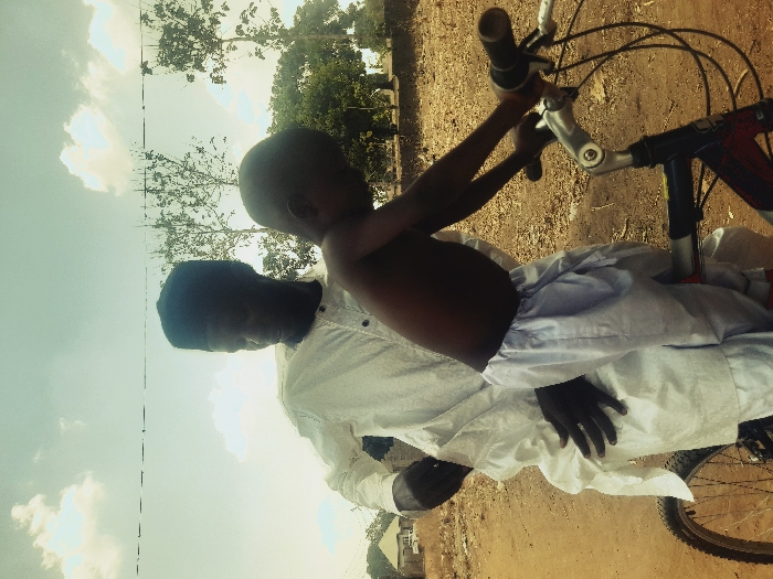Two dark-skinned individuals are positioned on a bicycle on a dirt path in Akwanga, Nigeria