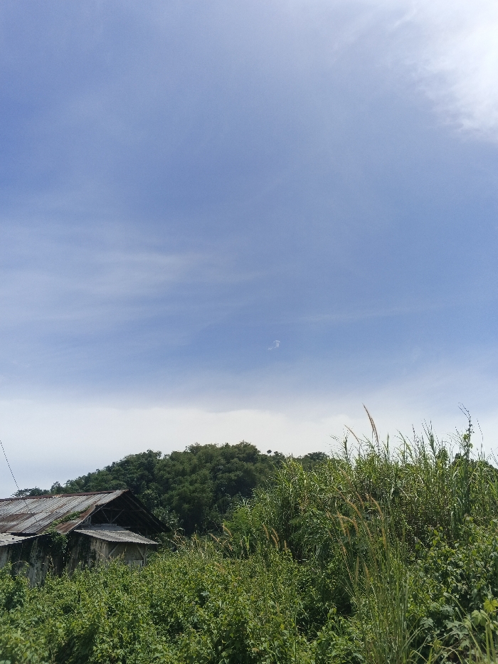 A wide, open expanse of light blue sky dominates the view, lightly touched with wisps of white clouds. Below, a landscape teeming with green vegetation merges with a wooded hill in the background. To the left, a weathered, dilapidated structure with a corrugated metal roof emerges from the dense foliage, its walls partially obscured by climbing vines. Tall grasses sway in the foreground, adding texture and depth to the scene.