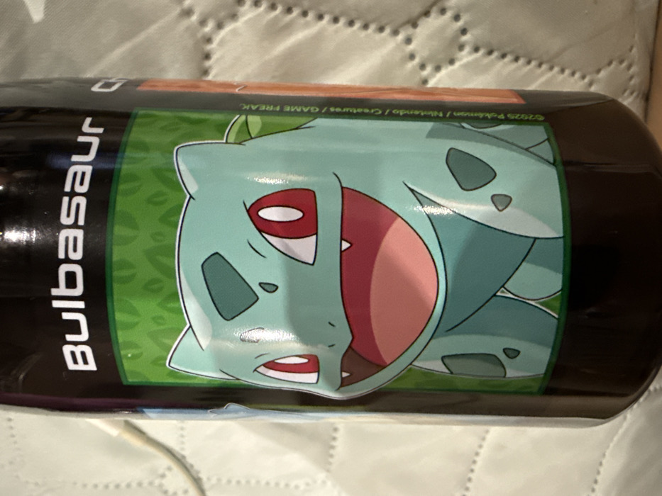 A dark cylindrical bottle or container, bearing a glossy label, is depicted in a close-up, angled shot. The label prominently features the white text "Bulbasaur" on a black background at the top. Below this, a large illustration of the Pokémon character Bulbasaur is displayed against a light green background with a subtle leaf pattern. The character is light teal/mint green with dark green markings, red eyes with white highlights, and an open mouth revealing a pink tongue and small white fangs. Vertically aligned white text on the right side of the label reads "©2023 Pokémon / Nintendo / Creatures / GAME FREAK." The bottle rests on a light-colored, textured surface, likely fabric such as a quilted blanket or bedspread, visible on both sides of the container. A thin white cable is partially visible on the left side of the frame. No individuals are present, and no actions or interactions are depicted. The specific location in Sofia, Bulgaria, cannot be determined from the provided image.