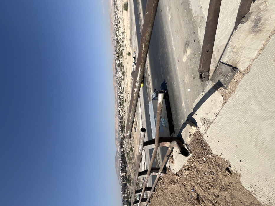 This forensic image captures an elevated perspective of a damaged guardrail overlooking a road and an urban settlement in Zamalka, Syria