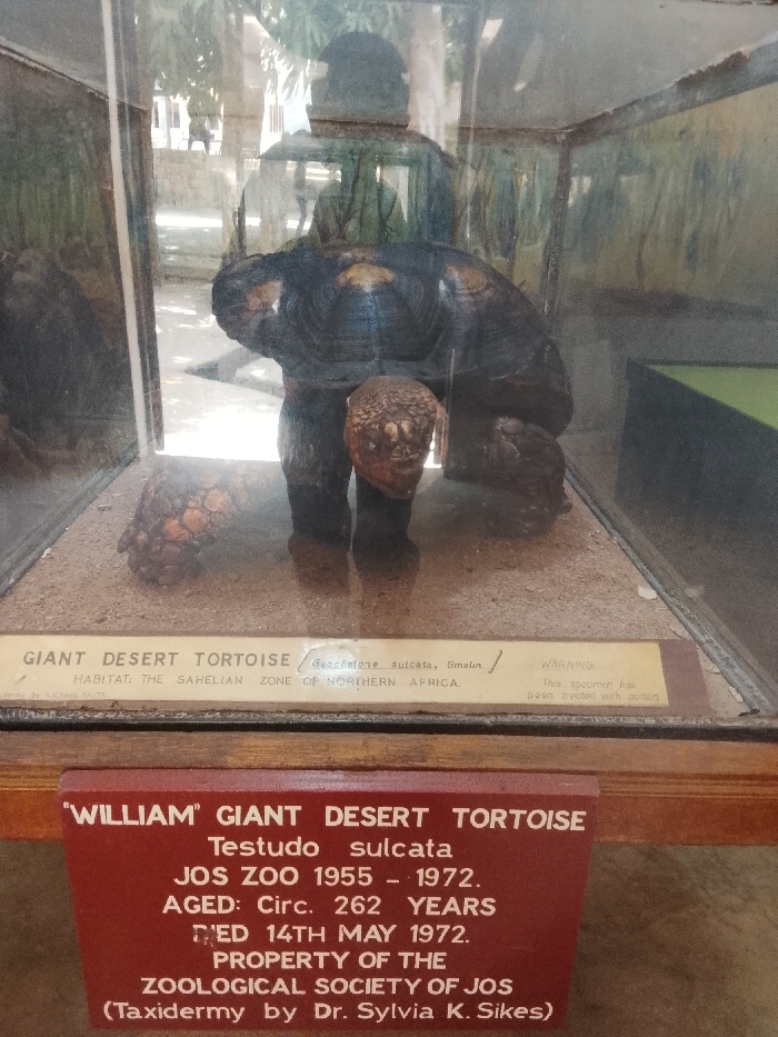 The image presents a taxidermied "William" Giant Desert Tortoise (*Testudo sulcata*, also *Geochelone sulcata*) within a glass display case with a wooden base. The scene is located at the Jos Wildlife Park (Jos Zoo) in Jos, Plateau State, Nigeria, as confirmed by signage indicating "JOS ZOO 1955 - 1972" and "PROPERTY OF THE ZOOLOGICAL SOCIETY OF JOS." The tortoise specimen is positioned on a light brown, sand-like substrate, depicting its natural habitat of the Sahelian Zone of Northern Africa. Labels state the tortoise died on May 14, 1972, at approximately 262 years of age, and the taxidermy was performed by Dr. Sylvia K. Sikes. A warning label indicates the specimen has been treated with poison. Reflections on the glass case reveal an outdoor setting with trees, architectural elements, and the discernible silhouette of an individual, presumably the photographer. The overall presentation suggests a museum or zoo exhibit.