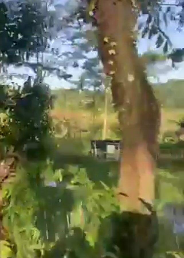 landscape view taken from a moving vehicle. The foreground features lush green vegetation, including trees and rice paddies. In the mid-ground, there are small wooden structures, possibly gazebos, scattered across the landscape. A hill covered in greenery is visible in the background under a bright blue sky with scattered white clouds. The camera pans across the scene as the vehicle moves, providing a glimpse of the natural environment.
