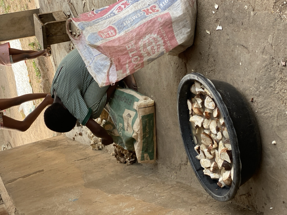 The scene depicts an outdoor or semi-outdoor activity in Idiroko, Nigeria, centered around the processing of root vegetables
