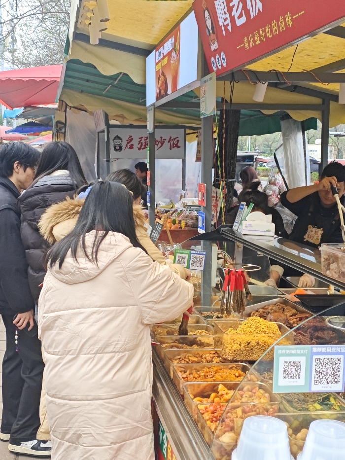 A bustling street food market scene showcases vendors serving customers. One stall advertises "Qiang's Fried Rice." Another, decorated in red, claims to offer "Chongqing's Best Marinated Delicacies." A woman in a beige puffer coat uses tongs to select items from a display case filled with various dishes. QR codes on the glass encourage customers to pay via WeChat Pay and Alipay. A line of people waits patiently, eager to sample the diverse culinary offerings.