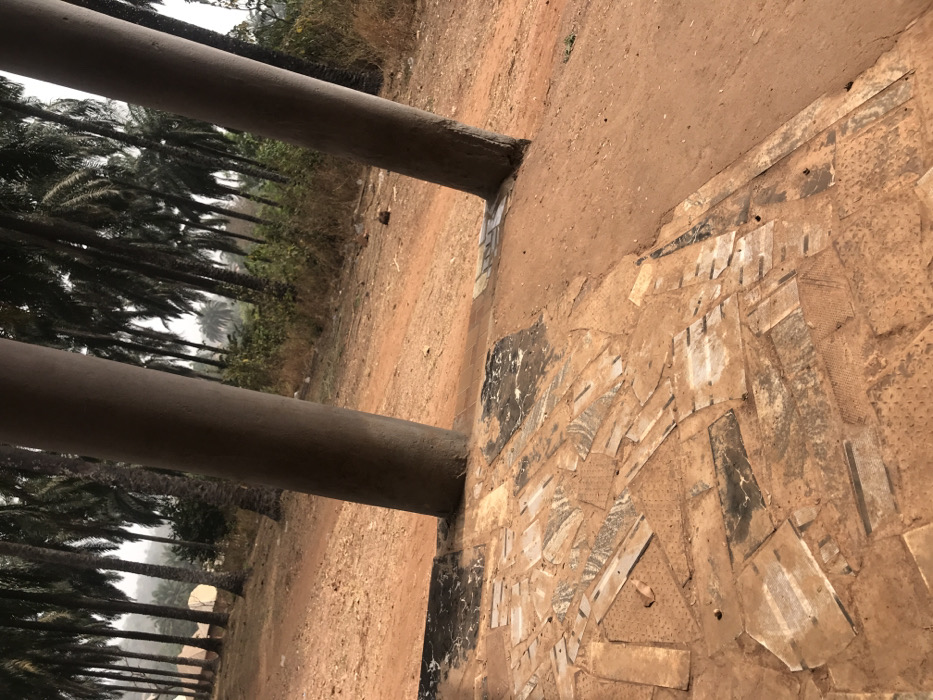 An earth-toned composition features two prominent, gray, cylindrical structures running horizontally across the frame. Beyond them, a densely packed grove of palm trees extends into the distance. To the right of the cylinders, an area of red-brown earth transitions into a tiled or mosaic surface featuring fragmented light and dark-colored pieces. The overall perspective is tilted, adding a disorienting effect.