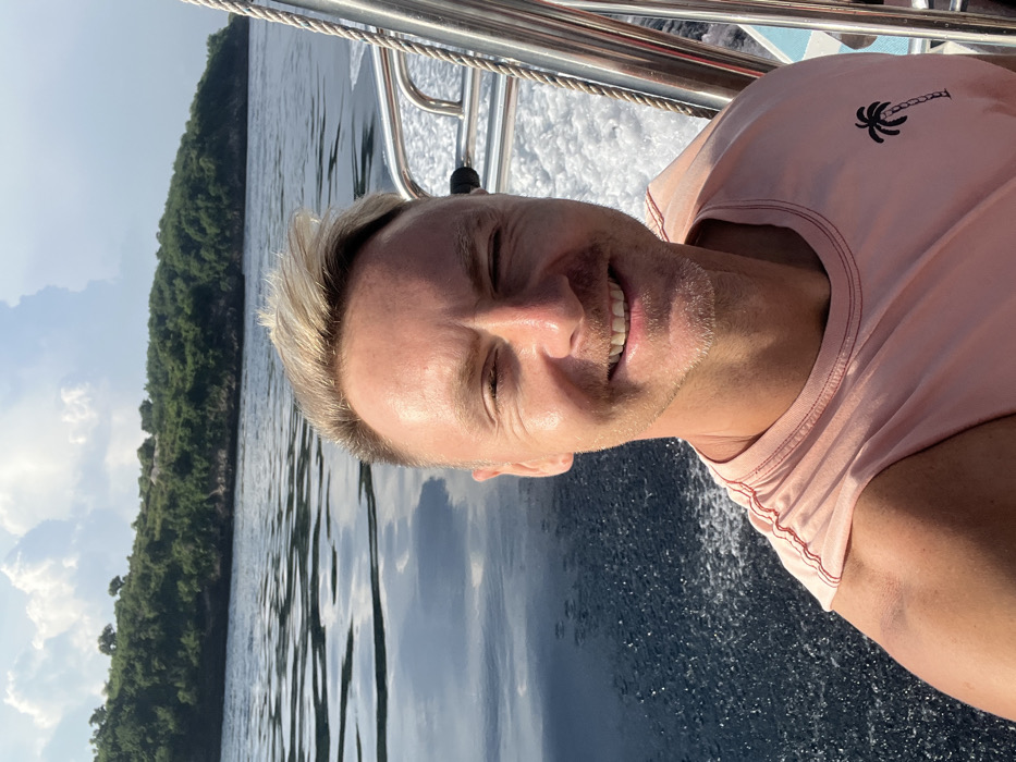 A fair-skinned man smiles broadly at the camera, his blond hair catching the sunlight. He's wearing a light pink t-shirt with a small black palm tree logo. The setting appears to be a boat on a body of water, possibly a lake or ocean. Behind him, a coastline with lush green trees is visible under a partly cloudy sky. Water splashes nearby, suggesting the boat is in motion. Metal railings are also visible, confirming the location.