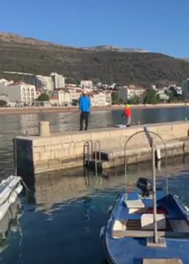 coastal scene on a clear, sunny day. A man in a blue jacket and a child in a red shirt are standing on a stone pier, fishing. The water around the pier is clear and calm. Several small boats are docked near the pier. In the background, there is a sandy beach and a row of buildings along the coastline. A mountain range rises in the distance, providing a scenic backdrop.