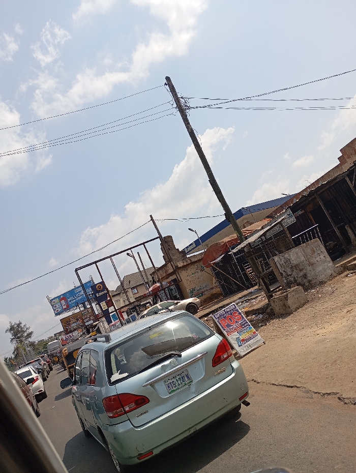The image depicts an urban street scene in Onitsha, Nigeria, observed during daytime under a partly cloudy sky. The perspective is from inside a stationary vehicle, looking forward and slightly to the right. In the mid-foreground, the rear of a light blue Toyota Avensis Verso wagon, equipped with a roof rack, is prominent. Its Nigerian license plate reads "KTS-174LN." To the right of this vehicle, on an unpaved dirt shoulder, stands a white signboard. The sign advertises "GIFTED FINGERS POS SERVICES," "MOBILE BANKING," and "UTILITY BILLS." Ahead of the Avensis, a queue of vehicles, including multiple cars and a yellow commercial tricycle (keke), indicates traffic congestion on the asphalt road. The right side of the street is bordered by a series of structures in varying states of repair, characterized by corrugated metal roofs, exposed wooden supports, and sections of deteriorating concrete. A tall, dark wooden utility pole heavily laden with multiple intertwined wires rises vertically in the center-right of the frame. Further to the left, another utility pole is visible. In the background, a large metal billboard structure displays advertisements for "RAINOL" and "MILLION CONVERT." No discernible individuals or specific actions are identifiable within the scene. The overall environment suggests a bustling commercial or residential area.