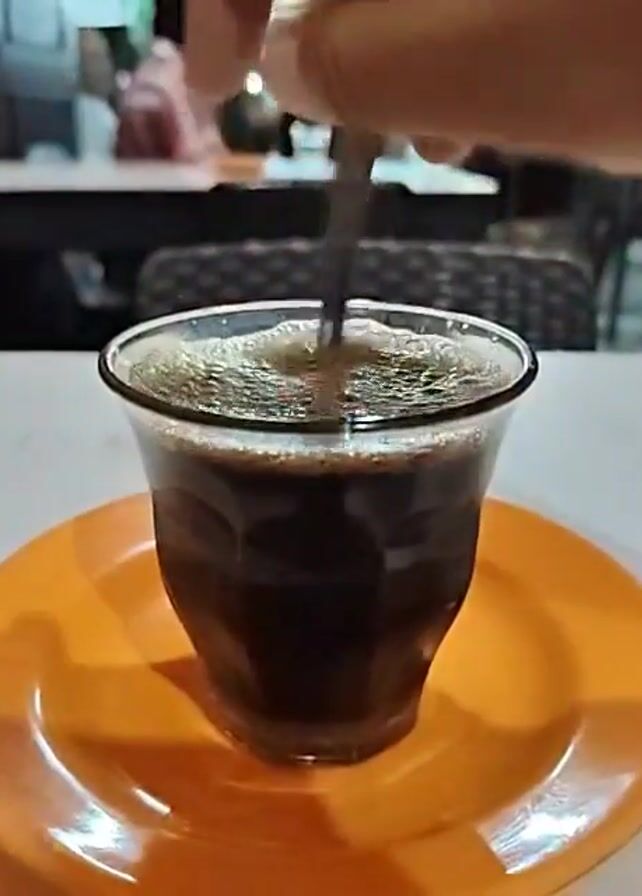 close-up of a glass of black coffee sitting on an orange plate. A hand holding a spoon stirs the coffee. The person then scoops up something with the spoon, and a thick stream of dark brown liquid is poured into the coffee. The background is out of focus, but a restaurant setting can be discerned.
