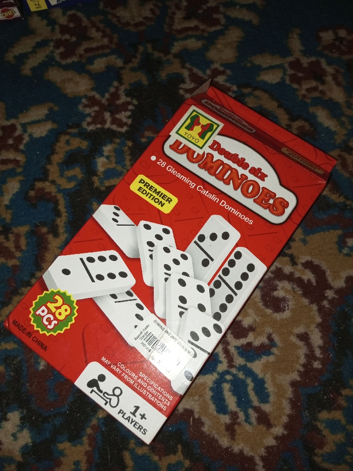 red box of YOYO Double Six Dominoes Premier Edition with 28 Gleaming Catalin Dominoes. Dominoes are pictured on the box. The box says "28 PCS MADE IN CHINA." There are instructions for 1+ player and specifications regarding colors and contents that may vary. A label with the text "Rumah Kads Dangur DOMING ING 2894333/361 2001418" is attached. The box is on a carpet. There is another game, partly seen, on the left side.