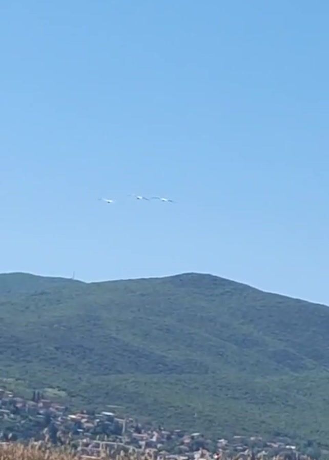 scenic view with a mountain covered in green vegetation taking up the upper-middle portion of the frame. In the foreground is a field of tall, dry grass in shades of brown and beige. A small town or settlement is visible at the base of the mountain, composed of buildings with red roofs. The sky above is a clear, bright blue. In the sky, several white birds are flying in formation. The camera is relatively stable, capturing a wide shot of the landscape.