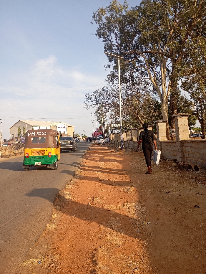 A street scene shows a three-wheeled vehicle with the license plate "PTA-6353" on the left, driving on a paved road. A car follows behind it. A woman walks on a dirt sidewalk to the right, carrying a white bag. Trees line the sidewalk, casting long shadows on the ground. A low stone wall with pillars runs along the edge of the sidewalk. Buildings and more vehicles are visible in the distance under a partly cloudy sky.