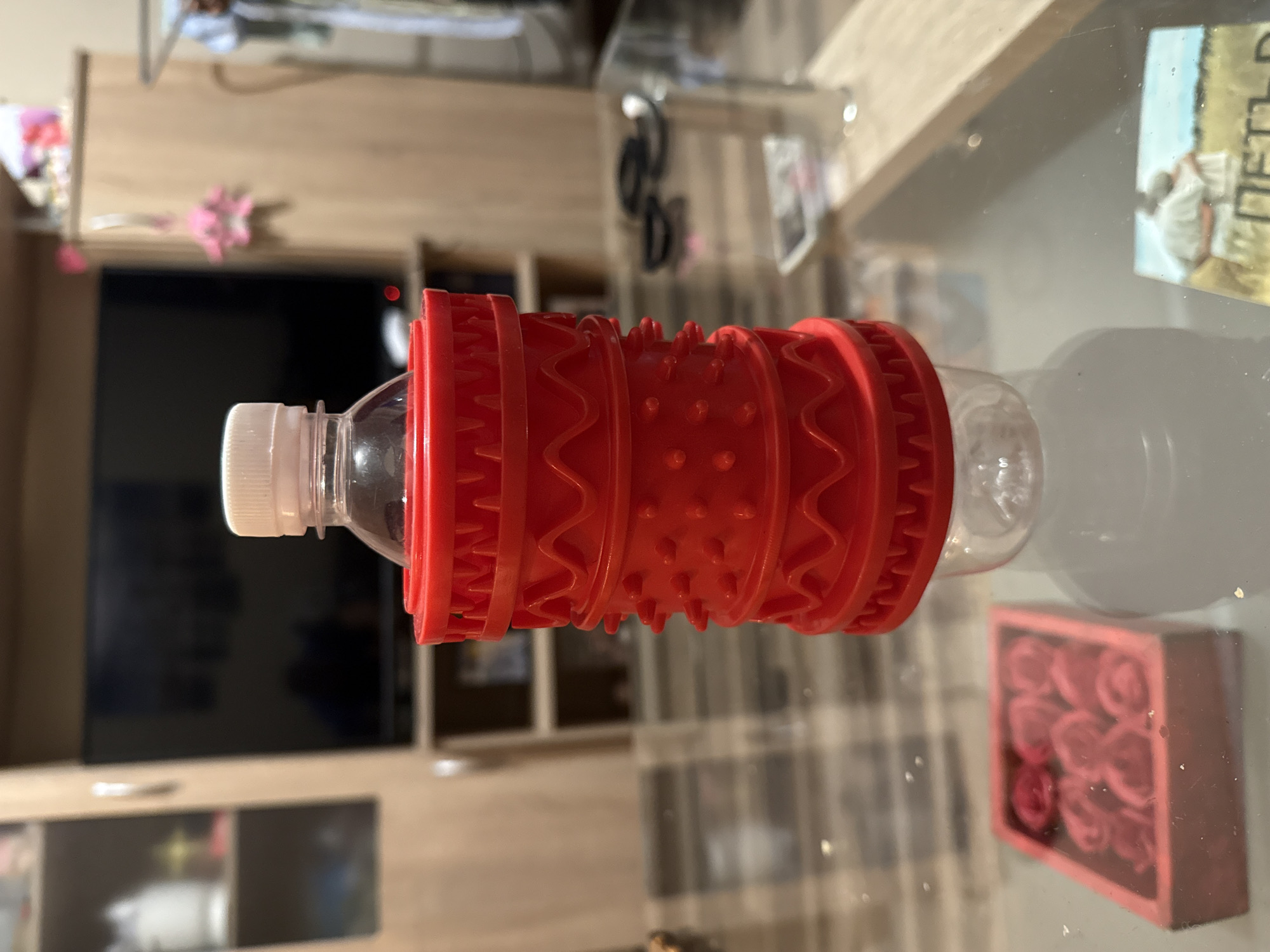 The scene, located in the city of Sofia, Bulgaria, features an indoor domestic setting focused on a clear plastic beverage bottle with a white screw cap, centrally positioned on a transparent glass table. The bottle's mid-section is encased in a textured, cylindrical red plastic sleeve, displaying prominent zigzag patterns on its upper and lower bands, and small conical studs across its central band. To the lower left of the bottle, on the glass table, a rectangular reddish-brown box contains multiple small, reddish, rose-shaped objects. To the lower right, a small rectangular coaster or decorative tile shows a blurred image of two figures in a field, with partially visible Cyrillic text. Several dark, circular objects are also indistinctly visible on the table surface further to the right. The background, largely out of focus, reveals light-colored wooden cabinetry and shelves. A large, dark rectangular screen, consistent with a television, is centrally visible on a media console. A pink, star-shaped ornament hangs from the cabinetry on the right, and a light-colored garment is partially visible hanging to the far right.