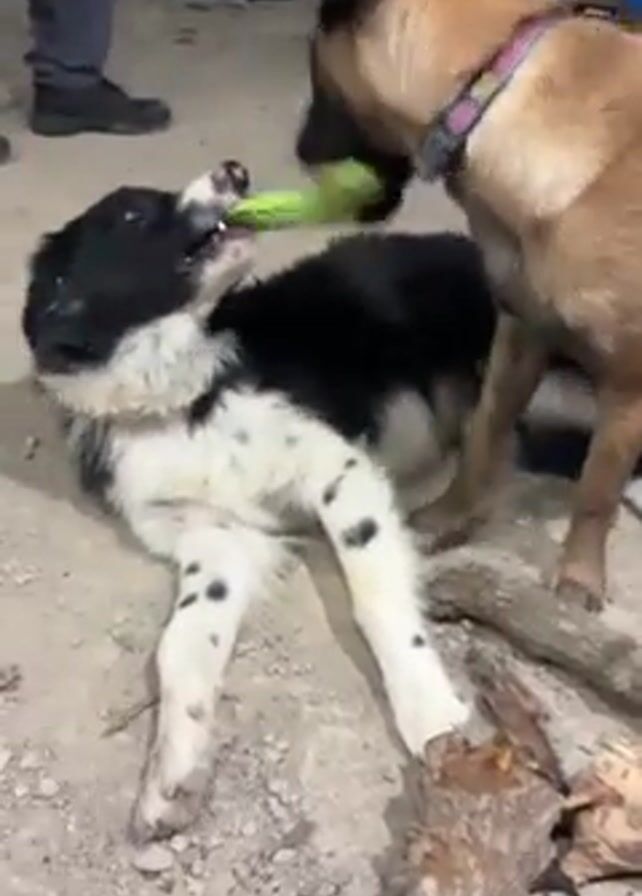 two dogs interacting on a dirt ground. One dog is a black and white Border Collie mix lying on its side. The other dog, a brown Belgian Malinois, is standing over the Border Collie mix, holding a green toy in its mouth, tugging at the Border Collie’s face. The Border Collie mix is trying to grab the toy. There is a small pile of wood next to the dogs. Several people are standing nearby, although their presence is peripheral to the main focus of the scene.