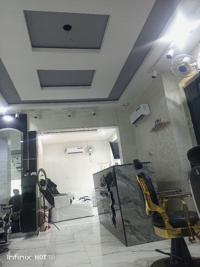 The scene depicts the interior of a commercial establishment, specifically a beauty salon or spa, located in Abuja, Nigeria
