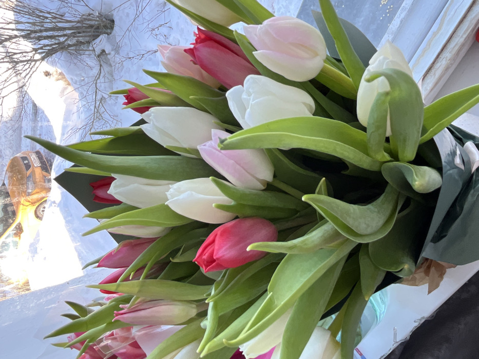 - "A bouquet of approximately two dozen tulips, predominantly in shades of white, pink, and red, with vibrant green stems and leaves, is presented" by FM-bcX6F2, licensed under CC BY 4.0