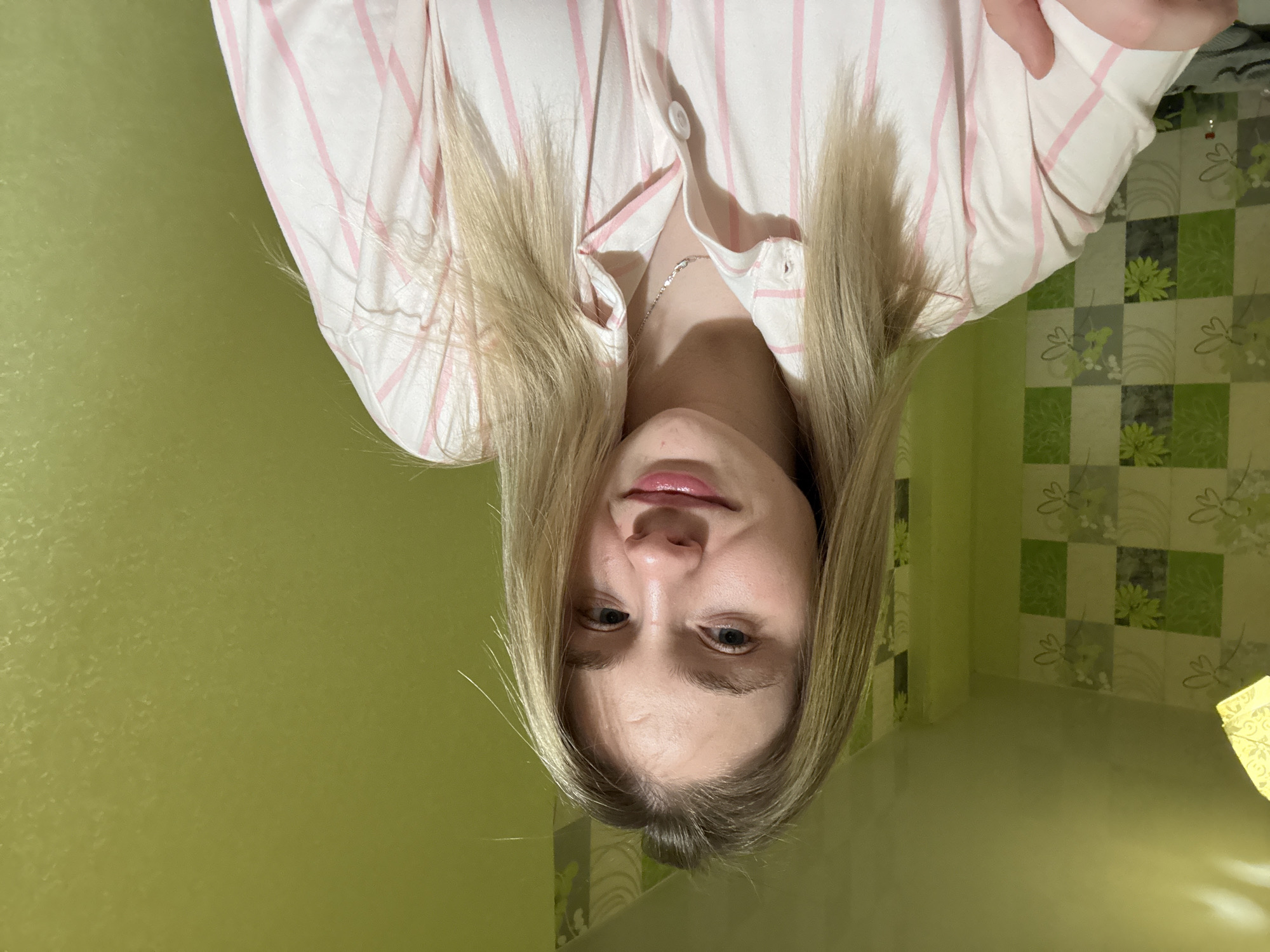 A blonde woman is seen from a close-up, upside-down perspective. She is wearing a light pink and white striped button-down shirt and a delicate necklace. The background reveals two different wall patterns: one a solid light green, and the other a checkered pattern of white and green squares with floral designs. A light fixture reflects light onto the bottom right corner of the scene. The location in Izhevsk, Russia is not evident from this image.