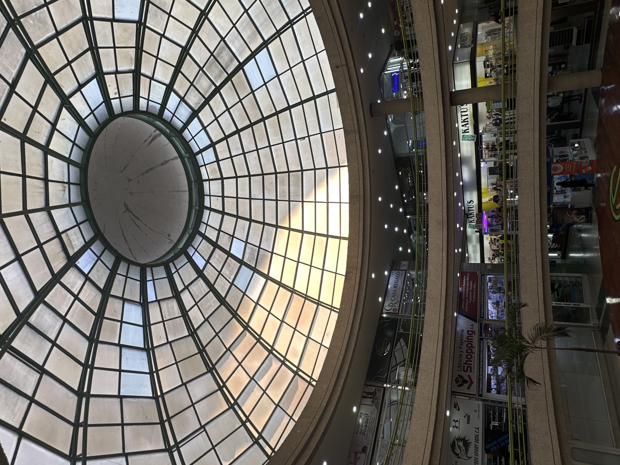 The image displays the interior of a multi-story shopping mall, identified as Centro Comercial Sambil Valencia in Valencia, Venezuela, viewed from an elevated perspective. The scene is dominated by a large, circular, domed skylight overhead, constructed with a grid of dark frames and translucent panels, surrounding a central, solid, light-colored circular dome. The skylight allows diffused natural light to enter, exhibiting variations of yellowish-orange and bluish hues. Below the skylight, the mall's architecture features concentric, tiered levels with curved concrete walkways. Each level is bordered by light green metal handrails. Numerous storefronts are visible across these levels. On the uppermost visible level, a store named "CASA REGALO" is identifiable on the right. On the intermediate level, from left to right, a sports store featuring brands like "NIKE" and "PUMA" is seen next to "Librería y Papelería Shopping C.A.," a bookstore and stationery shop. Further to the right on this level, the store "KAKTUS" displays multiple mannequins. On the lowest visible level, a store with a blue neon sign and another labeled "SOTELO" are partially visible. Several individuals are present throughout the mall's levels, appearing to be shoppers or employees. A solitary, slender palm tree stands on a lower level, reaching upwards into the mall's central open space. The environment is illuminated by a combination of natural light filtering through the skylight and artificial interior lighting fixtures.