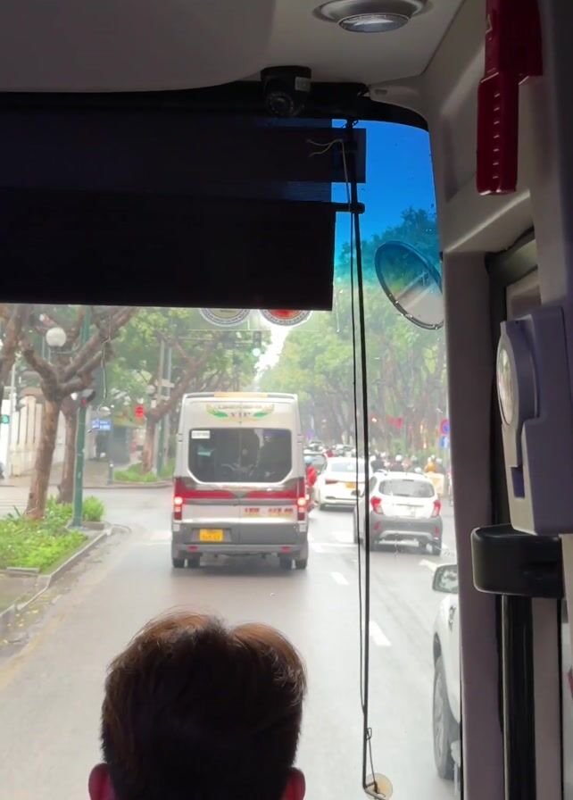 The view from inside a vehicle shows a street scene in a city