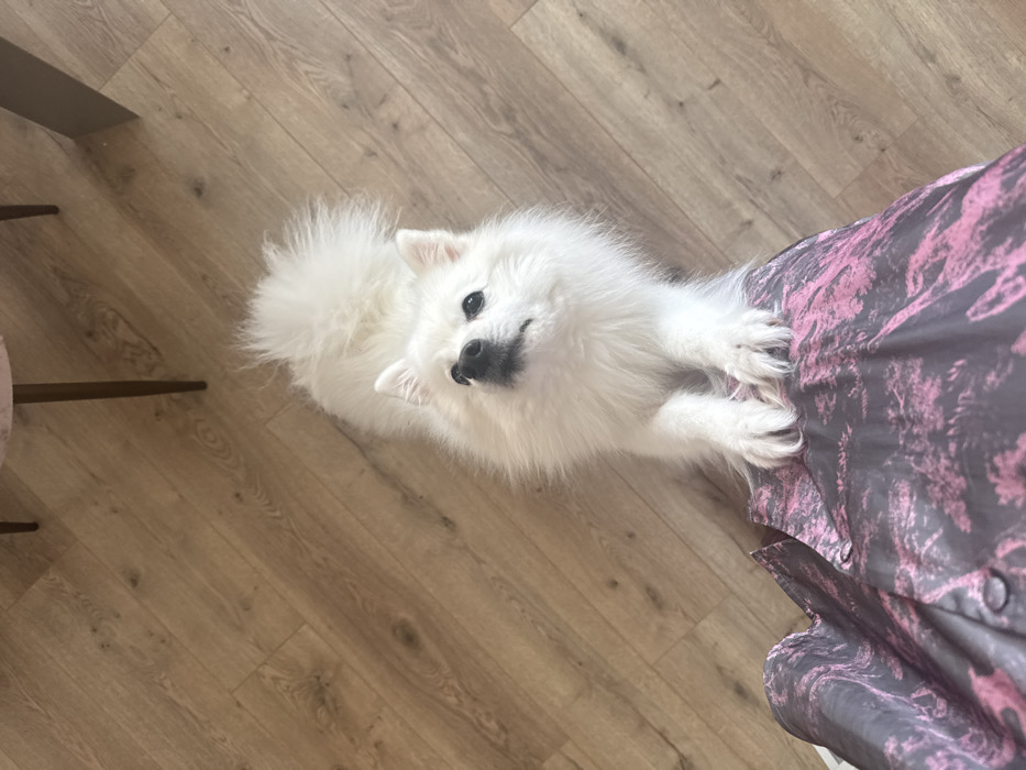 An indoor scene features a small white dog with fluffy fur, dark eyes, and a dark nose. The dog is positioned centrally, standing on its hind legs with its front paws resting on the lap of an unseen individual. Its head is tilted upwards, directing its gaze above the camera's perspective. The dog's tail is curled over its back. The lower torso and upper legs of the individual are partially visible, wearing a dark-colored garment with a mottled pink and magenta pattern. A button is discernible on the fabric. The floor is constructed from light-toned wooden planks. In the upper background, a slender dark furniture leg and a wider brown rectangular object, likely another furniture component, are partially visible. The specific location within the city of Perm, Russia is not ascertainable from the visual evidence.