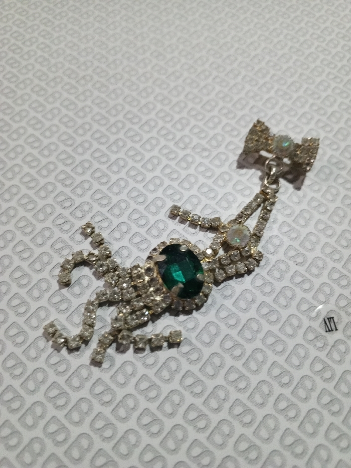 A piece of costume jewelry, designed in the stylized form of a feline, rests on a white, textured surface featuring a repeating embossed pattern of interlocking 'B' shapes. The jewelry is constructed from silver-toned metal, with the feline's head represented by a bow-shaped element adorned with clear rhinestones and a central opalescent cabochon. The body, limbs, and tail are composed of flexible chains of clear rhinestones. The torso features a prominent oval, faceted green gemstone, approximately 1 cm in length, surrounded by a halo of smaller clear rhinestones. The object is static. This scene is located in the city of Phakeo, Laos.