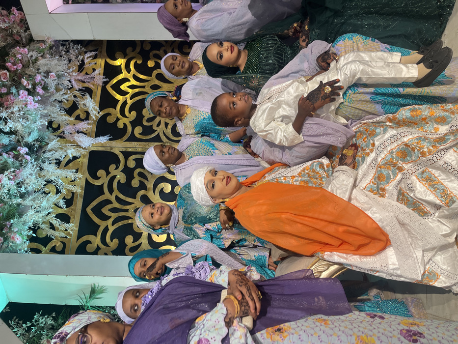 A group of nine people pose together. Seven are women, wearing colorful and ornate dresses and headscarves. One child is dressed in white, adorned with rings and henna. The setting appears to be a festive event, as indicated by the decorated backdrop featuring ornate gold patterns and floral arrangements. They all appear to be sitting or reclining closely together, creating a sense of unity and celebration.