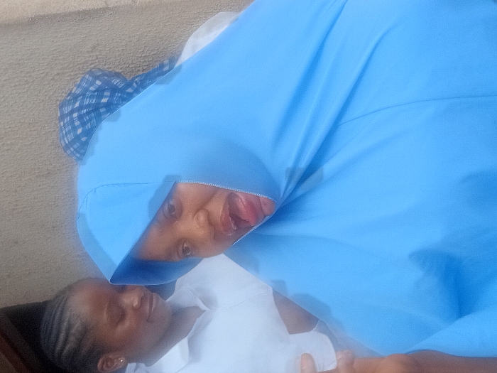 Two people are visible. One person wears a light blue head covering, with a partial view of their face and tongue sticking out. The other person, wearing a white shirt, lies horizontally, appearing to be sleeping or unconscious. The background consists of a beige wall and a checkered fabric partially visible behind the person in the head covering. The composition is close-up and somewhat tilted.