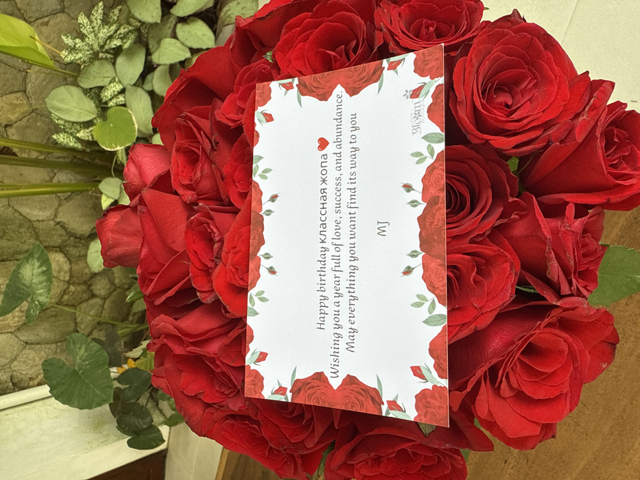 A bouquet of vibrant red roses surrounds a card. The card displays a birthday message in both English and Russian, wishing the recipient a year of love, success, and abundance. A small heart emoji accentuates the message. The card is signed "MJ" and features the "Bloom" logo at the top. The card's border is decorated with a delicate pattern of small roses and leaves, complementing the lush arrangement of roses.