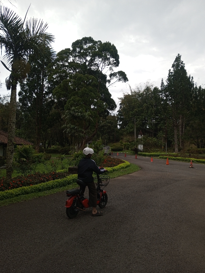 A person with a white helmet rides a red electric scooter on a dark paved road. The scooter has a black basket in front. Orange cones line the road. On either side of the road are green bushes with red flowers, with a variety of tall green trees in the background. The sky is overcast. A building is visible to the left, and a white car is visible on the road further ahead.