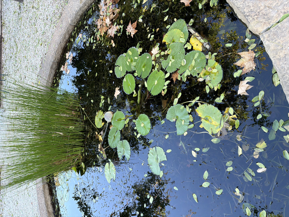 A close-up, high-angle view depicts a circular, stone-rimmed pond or fountain located in Paarl, South Africa. The pond contains dark, reflective water, which mirrors overhead elements. A dense cluster of tall, thin, bright green reeds grows centrally from the water in the upper half of the frame. Numerous green, circular to oval lily pads are scattered across the water surface, some exhibiting yellowish discoloration. The water also holds significant organic detritus, including countless small, light green to yellowish-green oval leaves, and several larger, lobed, light brown to reddish-brown fallen leaves, which are predominantly concentrated on the right side of the pond. The pond's perimeter features a rough, light gray stone rim. Beyond this rim, a light-colored gravel surface is visible along the upper right and top edges of the image. No people or animals are present in the scene.