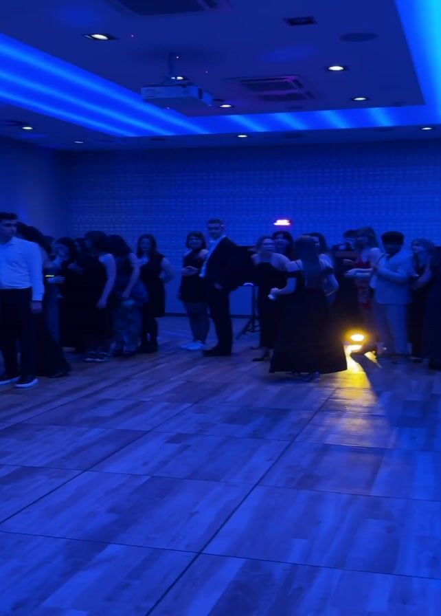 group of people in a dimly lit room, bathed in blue light. Most of the people are dressed in formal attire, primarily dark dresses and suits. Some are standing and chatting, while others are embracing. The room has a wooden floor and a patterned wall. There are some ceiling lights and a projector on the ceiling. The atmosphere appears celebratory.