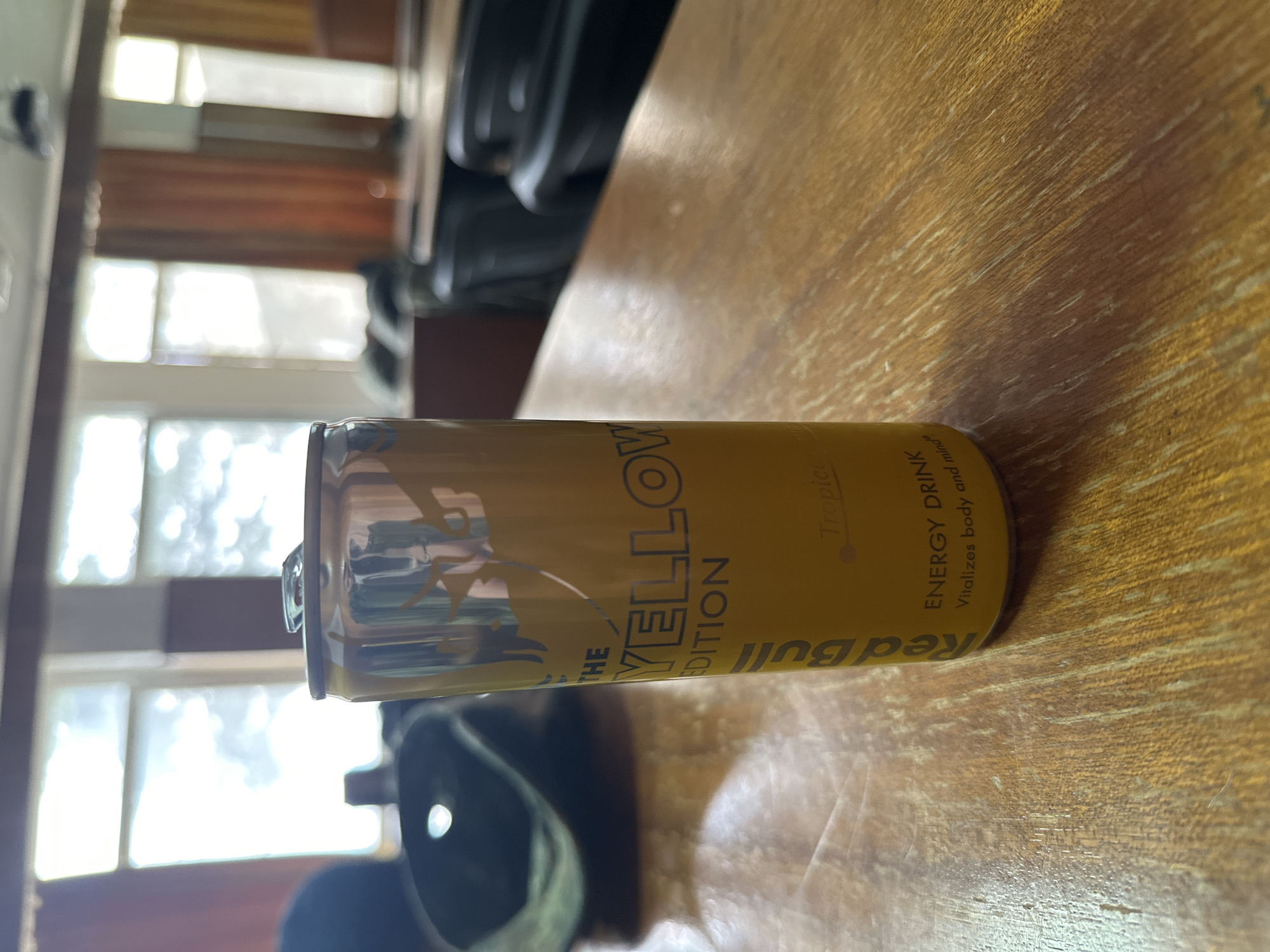 The scene depicts an indoor environment, likely a classroom or lecture hall in Veliko Tarnovo, Bulgaria. In the foreground, an opened Red Bull "The Yellow Edition" energy drink can, featuring tropical flavor text, stands upright on a light brown wooden desk or table. The can is predominantly yellow with silver accents at the top and bottom, and its pull-tab is raised. The wooden surface displays visible grain and minor wear. The background features multiple large windows, through which bright, diffuse daylight enters, obscuring the outdoor view. To the right of the windows, light orange or brown curtains are partially drawn. Further back, several dark, out-of-focus chairs and additional desk-like furniture are visible, consistent with an institutional setting. An indistinct dark object, possibly a bag or helmet, rests on a surface to the left of the can. No individuals are present in the image.