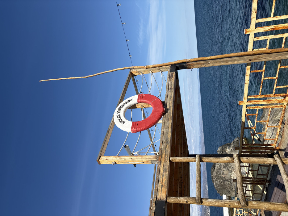 This image depicts a coastal scene in Alushta, Ukraine, focusing on a multi-level wooden pier structure situated over calm, deep blue water under a clear, bright blue sky. The upper level of the pier, constructed from rough-hewn timber logs and planks, features a railing composed of wooden posts and white rope. A red and white lifebuoy, with the text "БРОСАЙ УТОПАЮЩЕМУ" (THROW TO THE DROWNING) inscribed in black Cyrillic letters, hangs centrally on this railing. To the left, a wooden ladder-like support structure descends from the upper level. Below the upper deck, a lower platform is visible, partially obscured, with a heavily rusted yellow-orange metal railing facing the sea. A tall, slender, unvarnished wooden pole extends vertically upwards from the right side of the upper deck, and a string of exposed-bulb lights is strung horizontally from this pole towards the right, extending out of frame. Large, dark grey rocks are visible at the water's edge below the structures, integrating with the distant coastline. Hazy mountainous landmasses are visible on the horizon, particularly to the left. No individuals or active interactions are present in the scene.