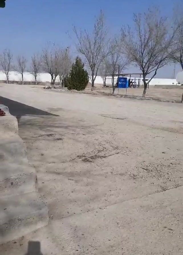 The camera pans from left to right across a flat, dusty lot under a clear blue sky. The foreground includes part of a shaded structure with a corrugated roof supported by a blue column. Concrete steps lead down into the lot. The shadow of a person holding the camera is visible on the steps. The ground is dry and cracked. In the distance, a row of leafless trees lines a fence. Behind the fence are several large, white cylindrical tanks and other industrial structures. A blue sign stands among the trees, but the writing on it is illegible.