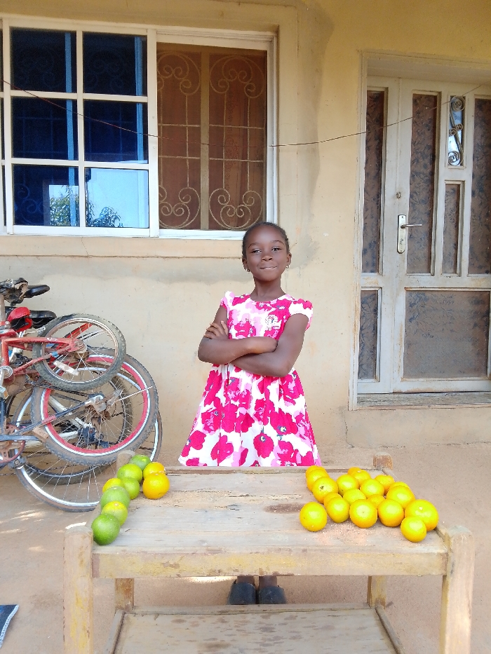 The scene is set outdoors in Gura Top, Nigeria, in front of a light-colored building with an unpaved dirt ground. A young Black girl, approximately 6-10 years old, stands centered in the frame, smiling with her arms crossed. She wears a short-sleeved, knee-length dress with a white background and large, bright pink floral patterns. In the foreground, a light-colored wooden table or stand is positioned, extending below the girl's waist. On the left side of the table, a linear arrangement of approximately 8-9 green, spherical fruits is visible. On the right side, a cluster of approximately 20-25 yellow/orange, spherical fruits is arranged. Beneath the table, a pair of dark shoes are partially visible. To the left of the girl and behind the table, two bicycles are present, with a red bicycle stacked partially over another, partially obscured bicycle. The building facade behind the girl features a white-framed window with multiple panes on the left, some reflecting blue, and a light-colored door with a decorative metal grill and a silver handle on the right. The overall lighting suggests a sunny outdoor environment.