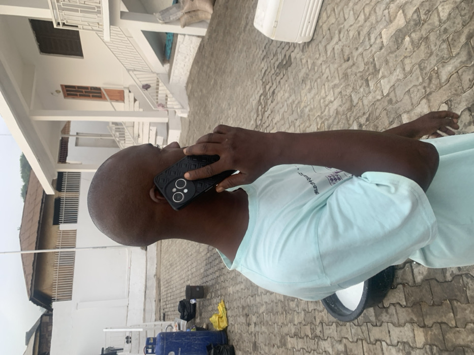 A bald man is on a phone call, holding a black phone to his ear. He wears a light blue t-shirt. The setting appears to be outdoors on a paved surface. In the background, there's a building with white walls and a building with brown trim. There are some scattered items on the ground including two blue tanks and yellow cloth. The perspective is from a low angle.
