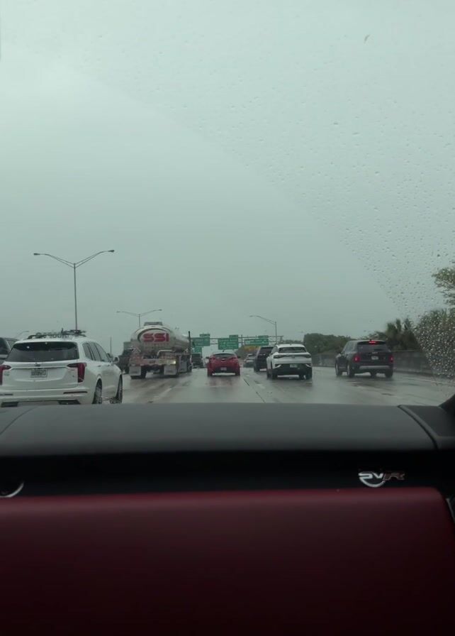 From the interior of a vehicle, the video shows a cloudy day on a highway. The windshield is covered in raindrops, and the wipers move. Traffic is visible ahead, including cars, SUVs, and a tanker truck with "SSI Chemicals" printed on its side. Streetlights line the side of the road, and green highway signs are overhead. The dashboard of the vehicle is in the foreground, with a red leather trim visible. An "SVR" badge is also visible on the dashboard.