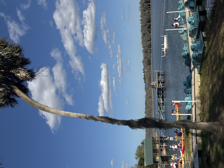 The image depicts a recreational waterfront scene at a lake in Micanopy, United States, under a clear blue sky with scattered white cumulus clouds. A tall, slender palm tree with a curved trunk and dark fibrous material covering its lower section occupies the left foreground. In the midground, a wooden dock with a green-roofed shelter extends from the left shoreline. Approximately 8-10 individuals are visible in this area, some preparing to launch or already positioned in red, yellow, and white kayaks and paddleboards. To the right, a longer wooden pier extends into the water, featuring a blue and white lifeguard chair at its terminus. A small white rectangular floating platform is situated in the water further out. Along the immediate right shoreline, several light blue pedal boats are docked, with two individuals occupying one boat further from the shore. The distant shoreline is densely wooded with deciduous trees.