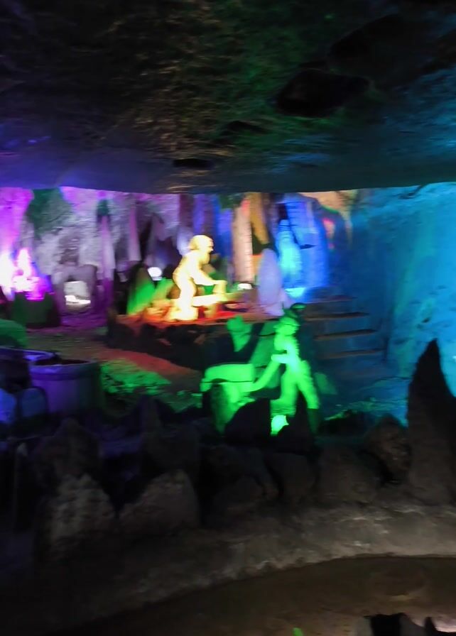 The video depicts a dark, narrow space resembling a cave or passage, illuminated by bright, colorful lights