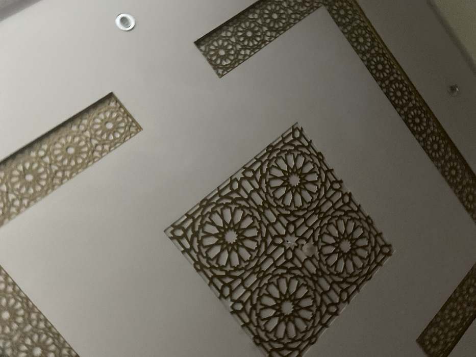 An off-angle view of a white ceiling decorated with intricate, geometric Islamic patterns in gold