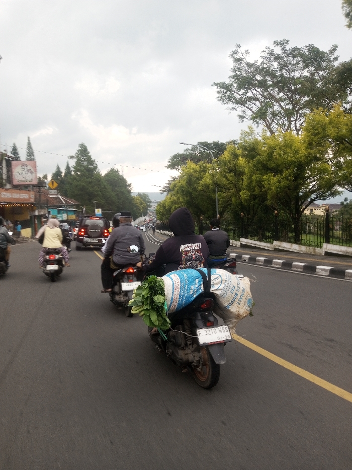 The image captures a street scene showing multiple individuals riding motorcycles on a paved road under an overcast sky. In the foreground, viewed from behind, a person wearing a black hooded sweatshirt with a graphic design on the back operates a dark-colored scooter. This scooter is heavily laden with cargo, including a large blue and white patterned sack strapped horizontally across the rear seat, a prominent bundle of green leafy vegetables secured to the left side of the blue sack, and an off-white sack vertically strapped to the right rear of the vehicle. The scooter's license plate, "F 3210 WBB," is visible, along with a date "01-29." Ahead and to the left of the foreground scooter, another person in a grey shirt and black head covering rides a dark scooter. Further forward, a person in a light-colored top rides a silver scooter. A dark SUV is visible behind these motorcycles, indicating general traffic flow. To the right of the foreground scooter, slightly behind, a person in a dark jacket and blue lower garment rides another dark scooter. The road features a solid yellow lane divider on the left and white markings. On the right, a zebra-striped curb abuts a metal fence, beyond which trees with green foliage line the street. In the middle ground on the left, buildings, one with an illuminated sign, suggest an urban or semi-urban environment. Distant hills or mountains are visible in the background. Regarding the specified location of Tangsibi, Bhutan, the visible license plate "F 3210 WBB" is consistent with vehicle registration in Indonesia, particularly the West Java region (e.g., Bogor, Sukabumi). The image does not contain any visual cues or signage to corroborate the location as Tangsibi, Bhutan.