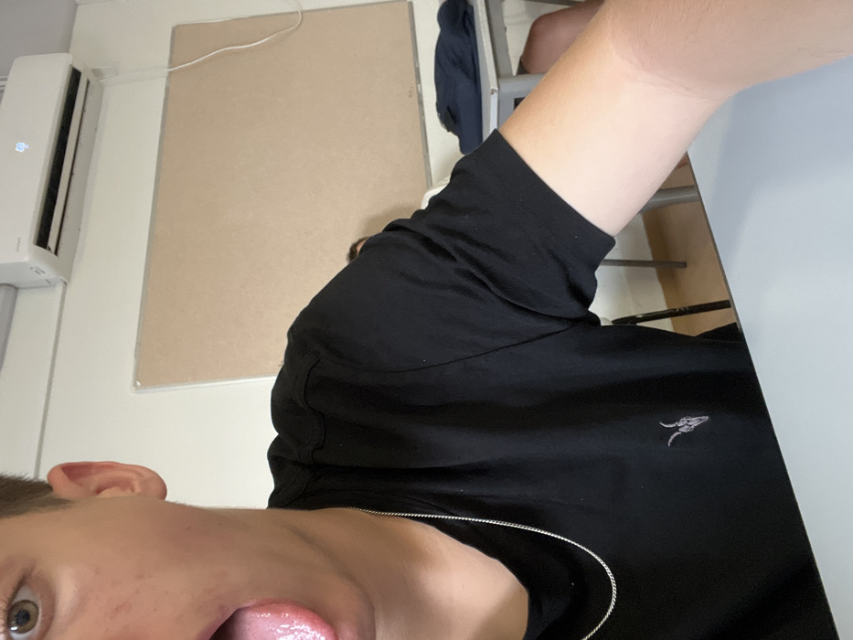 The image depicts an indoor scene, likely a classroom or office, located in Tel Aviv, Israel. In the foreground, a person's upper right torso and the right side of their face are visible, partially cropped. This individual is wearing a black short-sleeved t-shirt with a small white animal skull logo (consistent with the AllSaints brand) on the left chest, and a thin silver-colored chain around their neck. The person's right eye is open, and their tongue is extended from their mouth. Their right forearm rests on a light grey desk surface that occupies the bottom of the frame. In the background, a plain white wall is visible. Mounted on this wall is a large, rectangular light-brown bulletin board with a thin frame. Above the bulletin board, a white wall-mounted split-unit air conditioner with a blue digital display is present, from which white electrical cables extend along the wall. To the right of the foreground subject, another light grey desk or table is visible, upon which a folded dark blue garment rests. The head and a shoulder of a second person are partially discernible behind the foreground subject and the desk.