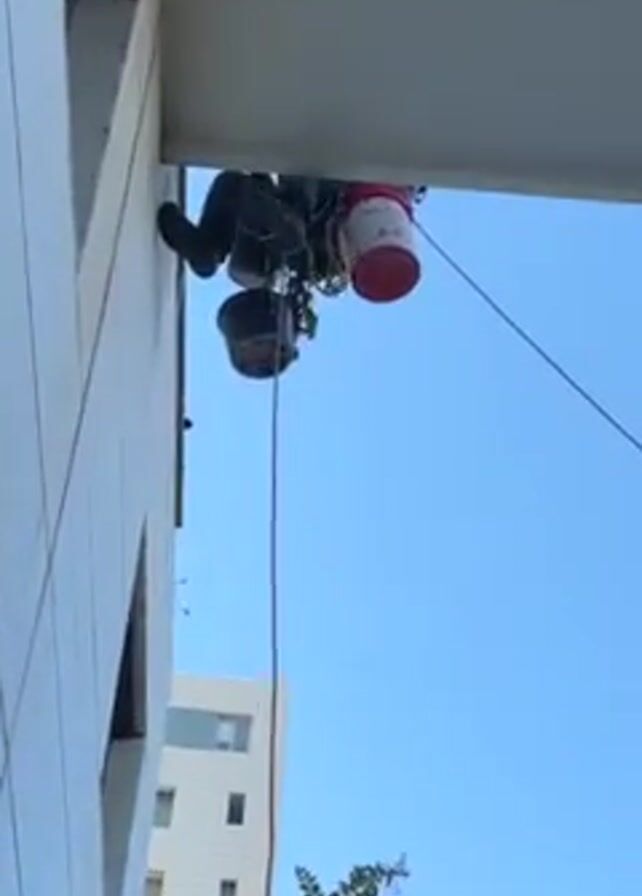 From a low angle, the video depicts a worker suspended by ropes while working on the exterior wall of a multi-story building. The worker is wearing dark clothing and boots. Attached to the worker are two buckets, one red and one black. The worker is positioned under an overhanging section of the building's structure, with a clear blue sky visible in the background. A few trees are also visible, partially obscuring another building in the distance. A rope stretches down from the worker toward the ground.